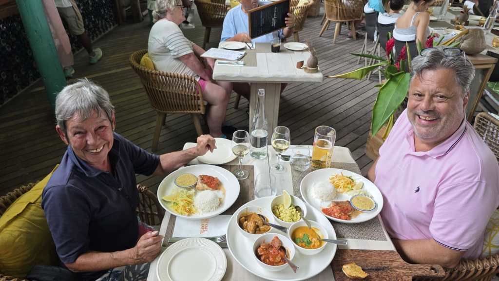 Wir landeten in einem kleinen, typisch kreolischen Restaurant direkt am Wasser und haben uns durch die gesamte Speisekarte gefuttert: Red Snapper, Gambas-Curry, Hai, Hühnchen, alles super würzig und mega lecker. Dazu kaltes Seybrew-Bier und Südafrikanischer Wein – das Gefühl „jetzt könnte die Welt untergehen, Hauptsache der Teller bleibt voll“. 😋