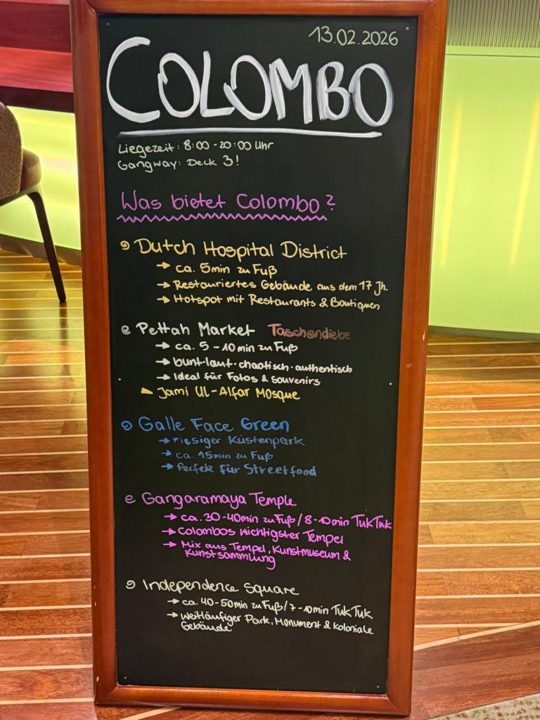 Weiter nach Colombo. Und ehrlich? Die Stadt hat sich in 40 Jahren kaum verändert. Immer noch diese feuchte, klebrige Hitze (über 30 °C, Luftfeuchtigkeit jenseits von 90 %), immer noch Häuserfassaden, die halb schwarz vor Schimmel sind, Straßen voller Hupen, Tuk-Tuks und Leben – chaotisch, dreckig, laut, echt.