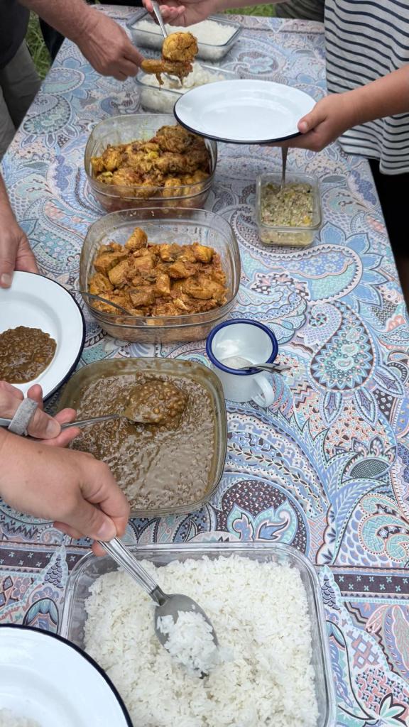 Direkt nebenan haben wir dann im Wald an einem beliebten Picknickplatz gegessen – sonntags kommen hier die ganze Insel-Familien her. Stilvoll mit Tischdecken, Stoffservietten, warmem Reis, gegrillter Dorade, Hähnchen, Linsen und einer herrlich scharfen Sauce „piment“ – dazu kaltes Bier und danach Kaffee + hausgemachter Kuchen. Einfach, herzlich und unglaublich lecker.