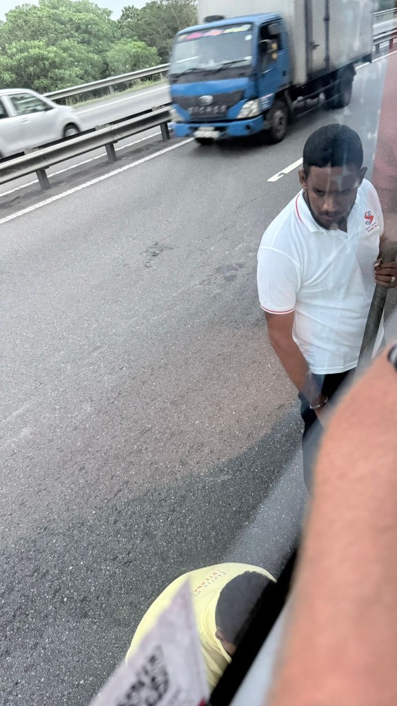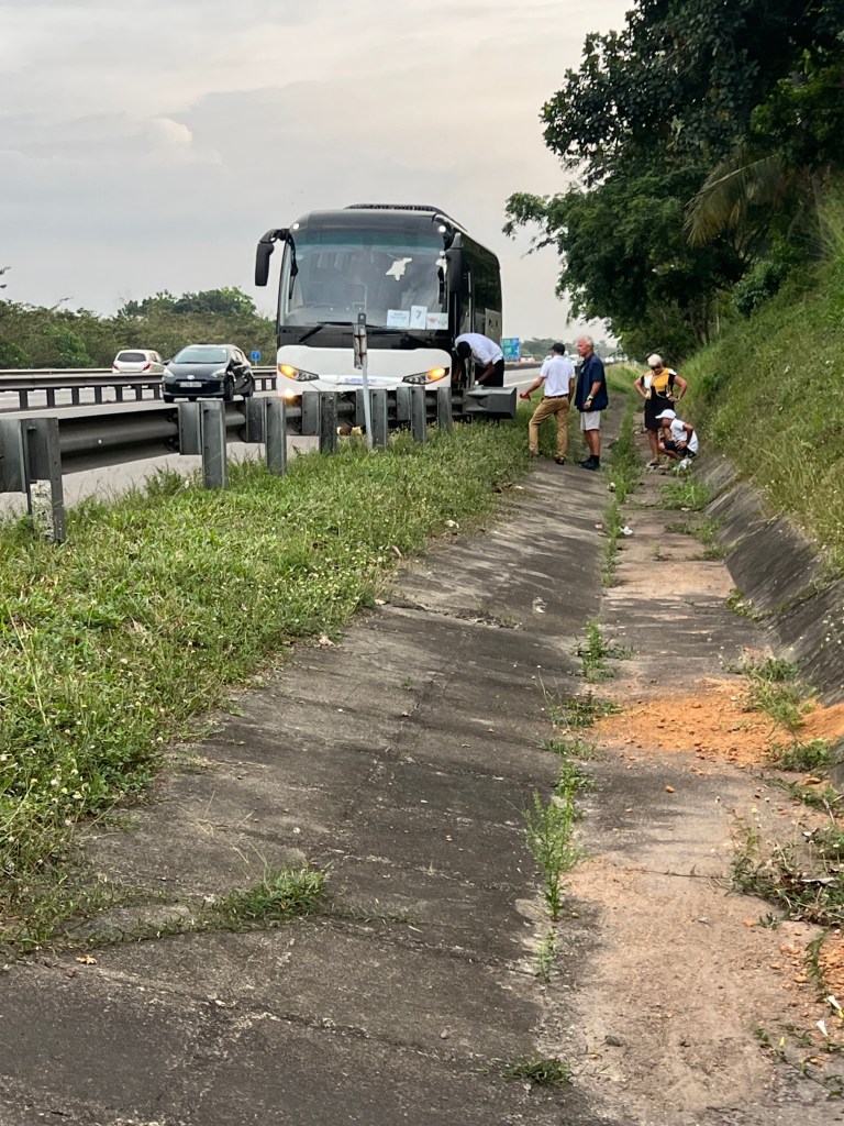 Rückfahrt dann über die neue Autobahn – deutlich schneller als durch die Dörfer. Und plötzlich – BAMM! Der Bus ruckt brutal nach links, Warnblinklichter an. Reifenplatzer. Mitten auf der Autobahn. Kein Standstreifen, kein Parkplatz. Der Fahrer (angeblich alle hier Mechaniker-Ausbildung) steigt aus, schraubt seelenruhig den Reifen runter und montiert das Reserverad – direkt neben dem fließenden Verkehr. Wir stehen daneben, staunen, schwitzen und hoffen, dass nichts explodiert.