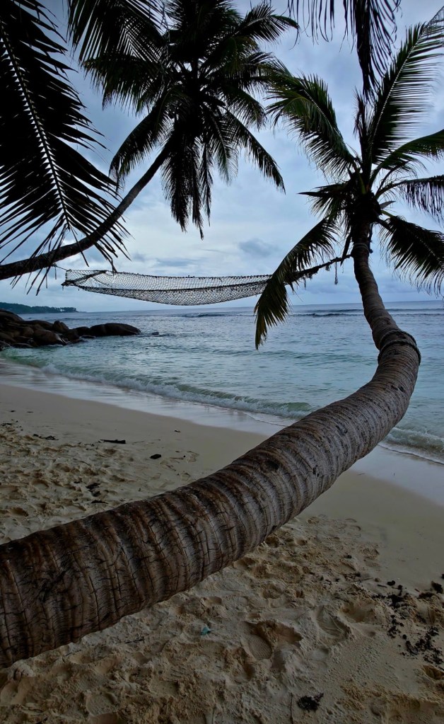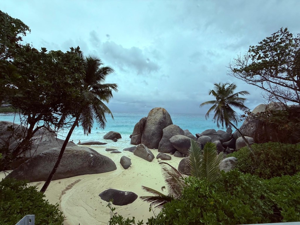 Dann raus aus der Stadt, Richtung Norden nach Beau Vallon. Der berühmte Strand mit den ganzen Hotels und Restaurants – bei dem Wetter eher eine dramatische Grau-in-Grau-Nummer mit wild peitschenden Palmen. Trotzdem: Wow, was für eine Kulisse!