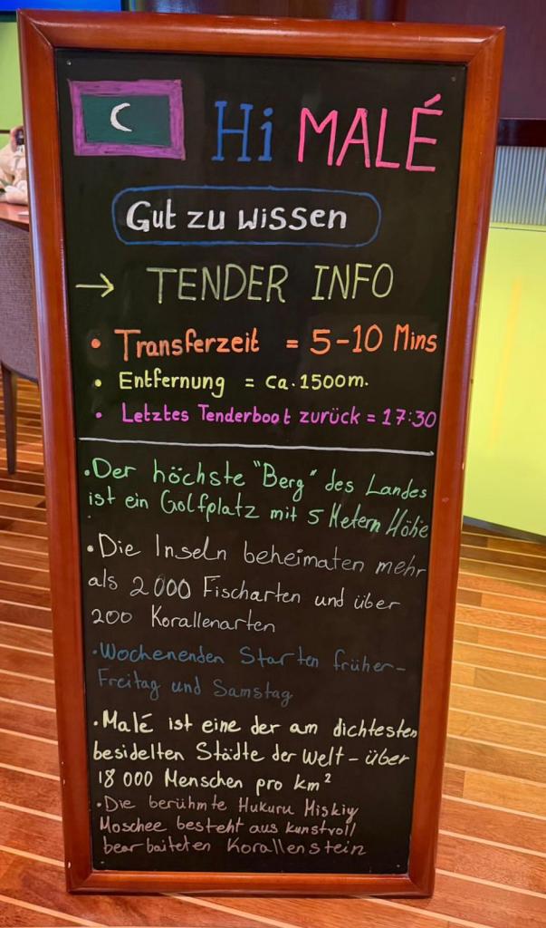Unser Ausflug begann um 09:00 Uhr mit dem Treffpunkt „Ein ganzer Tag am Strand: Centara Rasfushi Resort“. Nach einer kurzen Fahrt mit dem Tenderboot nach Malé und Umstieg auf ein örtliches Boot erreichten wir bei starkem Seegang die Insel im Nord-Atoll. Dort angekommen, wurden wir über die Mittagszeiten von 11:30 bis 13:00 Uhr informiert.