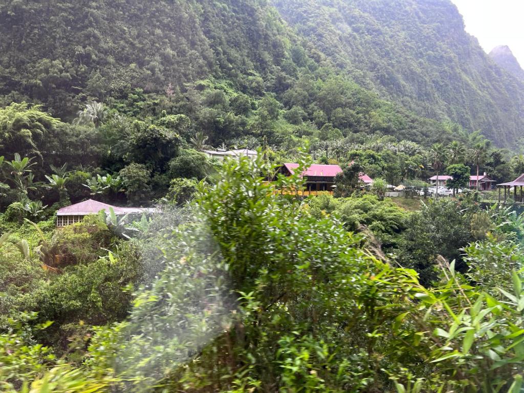 Hell-Bourg selbst hat uns sofort verzaubert. Früher ein Kurort mit heilender Quelle (die nach einem Taifun spurlos verschwand), heute eines der schönsten Dörfer Frankreichs. Weil die Quelle weg war, haben die Bewohner einfach beschlossen: „Dann malen wir halt alles bunt!“ Und genau das macht den Ort so besonders – pastellfarbene Kreolenhäuser mit Wellblechdächern, Holzbalkone, üppige Gärten. Ein bisschen wie ein Freiluft-Farbkasten mitten im Regenwald.