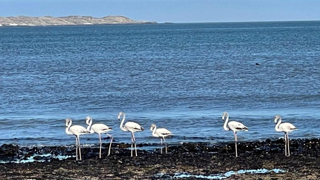 Unsere Erkundungen in Walvis Bay hatten wir bereits vor einigen Jahren unternommen, einschließlich der Düne 7 (selbst dort wird jetzt Eintritt verlangt), der Mondlandschaft, einer interessanten Pflanzenwelt und zahlreichen Flamingos. In diesem Jahr berichteten Mitreisende, dass nur einige weiße Flamingos zu sehen waren.