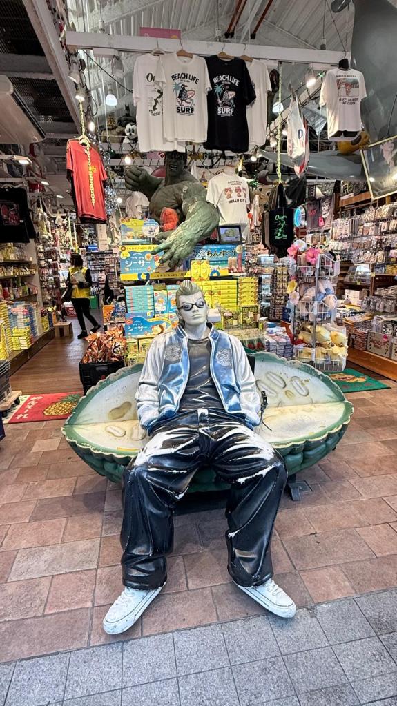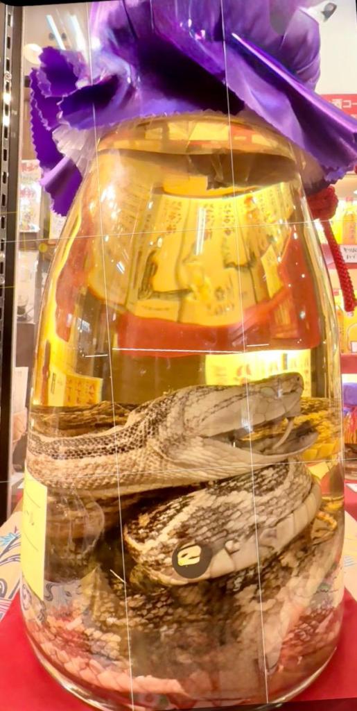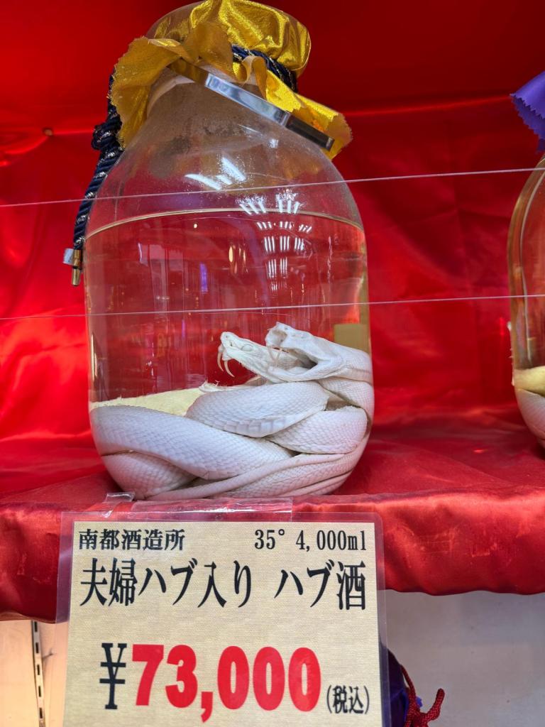 Direkt danach kam der obligatorische Souvenir-Bummel durch die angeschlossene Anlage. Neben den üblichen Andenken gab’s richtig spannende regionale Schätze: echtes okinawanisches „Kölsch“-Bier (ja, wirklich!) und natürlich Habushu – den berüchtigten Schlangenschnaps. Da schwimmt tatsächlich eine echte, giftige Habu-Grubenotter in der Flasche mit drin. Mutig oder verrückt? Auf jeden Fall ein echtes Gesprächsthema!