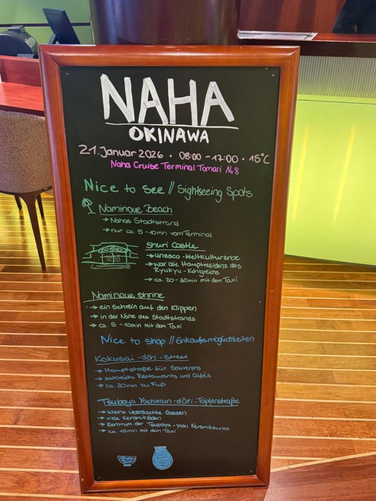 Unser Tag begann mit einem sehr bewegenden Moment: dem Friedensmuseum, das an die Schlacht um Okinawa erinnert. Die Stadt wurde im Zweiten Weltkrieg fast vollständig zerstört – über drei Monate hinweg hagelte es ununterbrochen Bomben von See und aus der Luft. Das Ergebnis war verheerend: rund 240.000 Menschen verloren ihr Leben. Die Originaldokumente, Fotos und persönlichen Gegenstände im Museum gehen richtig unter die Haut – ein stiller, nachdenklicher Start in den Tag.