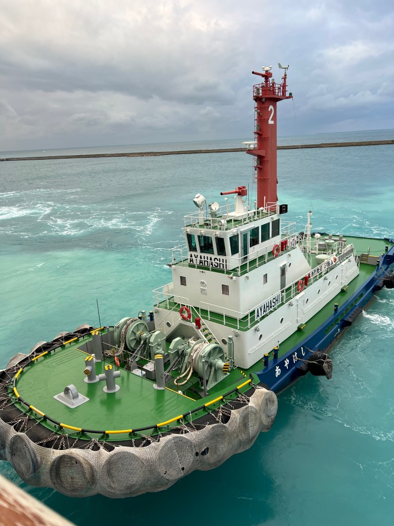 Dank der 2 Schlepper konnten wir anlegen, tatsächlich ist aber auch keine Fähre in den Hafen gekommen, so war es spannend zu sehen, wie das Auslaufen funktionieren würde. Wie sich herausstellte, sind wir begleitet von 2 Schleppern, die jedoch nicht aktiv eingreifen mußten, sicher aus dem Hafen gekommen, auch wenn dabei das eine oder andere „Schlagloch“ auftrat.
