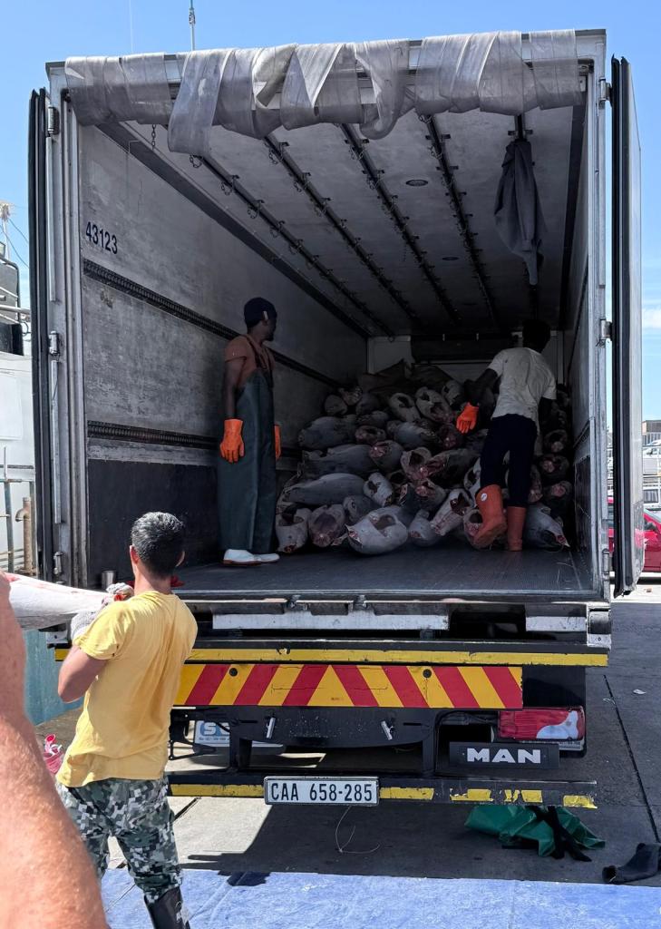 Während unseres Spaziergangs durch eine Sackgasse beobachteten wir, wie tiefgefrorene Thunfische vom Boot in einen Lkw verladen wurden – ein interessanter, wenn auch unerwarteter Anblick.