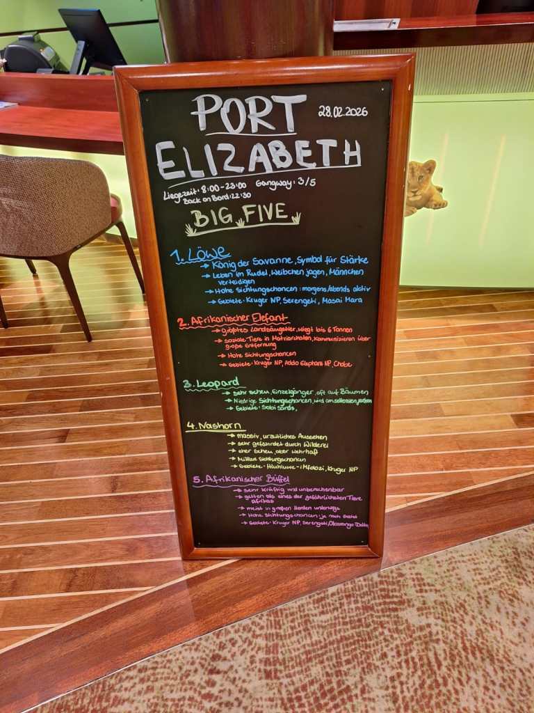 Nach unserem Aufenthalt in Durban, wo wir bereits alle Sehenswürdigkeiten kannten, entschieden wir uns, in Port Elizabeth an Bord zu bleiben. Einige Mitreisende wagten einen kurzen Ausflug in die Stadt und bestätigten unsere Eindrücke: Port Elizabeth präsentiert sich nach wie vor als eher schmutzig, mit zahlreichen fehlenden Steinen auf den Bürgersteigen – eine echte Stolperfalle! Leider wurde dies einem Mitreisenden zum Verhängnis, der sich dabei die gesamte linke Gesichtshälfte aufriss und einen Krankentransport benötigte. Port Elizabeth eignet sich somit nur als Ausgangspunkt für einen „Zoobesuch“, der hier Safari genannt wird und den wir gerne vermieden haben.