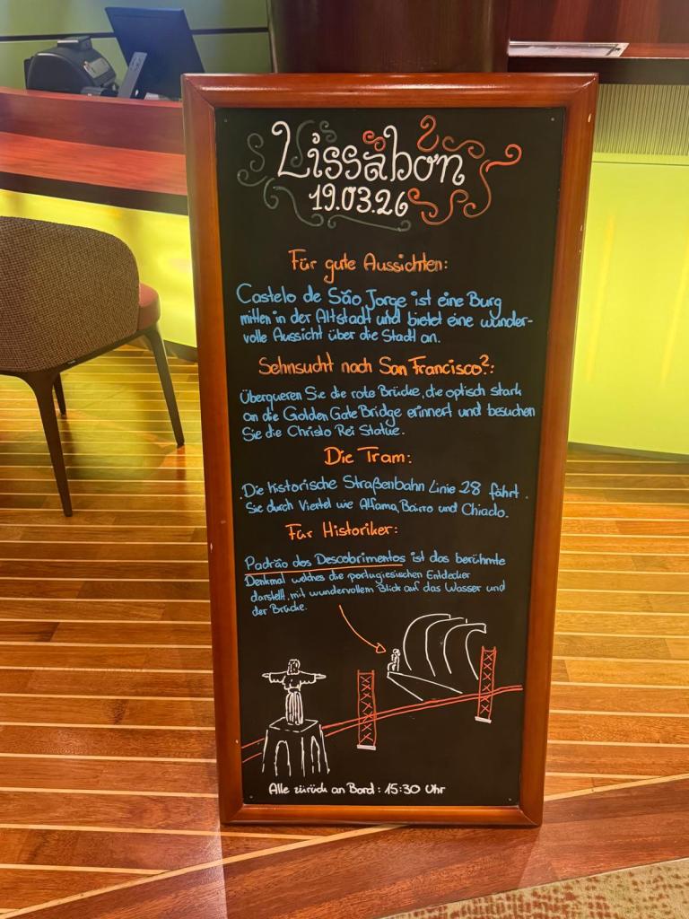 Rückweg zum Schiff, noch ein Kaffee an Bord, entspannt vom Balkon aus zugucken, wie Lissabon langsam kleiner wird. Abfahrt am Nachmittag gegen 16 Uhr Richtung Norden – Heimat ruft.