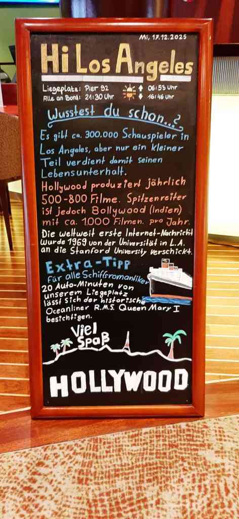 Los Angeles ist gigantisch. Mit rund 1.300 Quadratkilometern ungefähr halb so groß wie das Saarland – fühlt sich aber deutlich größer an, vor allem, wenn man im Stau steht. Und davon gibt es in L.A. reichlich. Eigentlich immer. Weil die öffentlichen Verkehrsmittel eher unter „gut gemeint“ fallen und die Stadt gefühlt 24 Stunden am Tag verstopft ist, verzichteten wir freiwillig auf ein eigenes Foto vom berühmten Hollywood-Schriftzug (von Mitreisenden geklaut, aber dafür auch nicht im Nebel).
